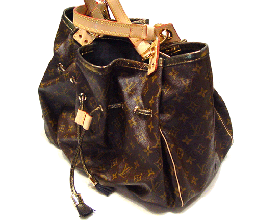 모노그램 캔버스, 천연 소가죽과 세퀸 트리밍, 마이크로파이버 라이닝 - 골드 금장 장식 - 내부에 두개의 수납공간, 지퍼 장식의 한 개의 중앙 수납공간 - 플랫 레더 핸들로 핸드백이나 숄더백으로 연출 가능 - 보호를 위한 하단의 스터드 장식
