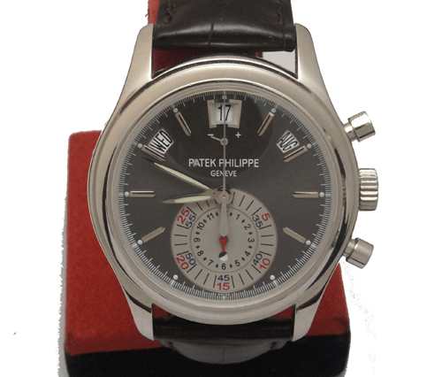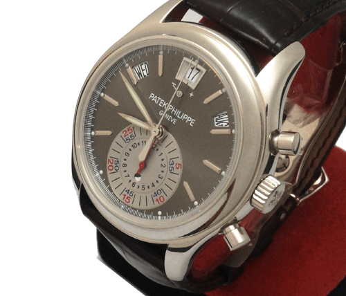 Patek Philippe 5960P Series: Calendar Style (Gender): Mens Case Material: 950 Platinum Dial Color: Charcoal and Silver Gray Movement: Automatic Engine: Patek Philippe Caliber CH 28-520 IRM QA 24H (28,800 vph, 40 jewels) Functions: Hours, Minutes, Seconds, Power Reserve (at 12 o'clock), Date, Chronograph, Day/Night indicator Watch Chronograph: Monocounter dial at 6 o'clock records minutes around outer circle. The first 30 minutes are indicated via red minute markers. The second 30 minutes are indicated via an inner track of blue minute markers. Hours and half-hours are read off another concentric inner circle (up to 12 hours). Half-hour diamond markers are used to determine which track should be read off on the outer circle for the minutes. If the blue-lacquered brass hand is situated above the diamond marker, the inner blue minutes are read off via the red-lacquered brass hand. Chronograph incorporates flyback feature. Chrono is activated by pusher at 2 o'clock and reset/flyback at 4 o'clock. Crystal Material: Sapphire Crystal - Scratch Resistant Case Diameter: 40.5 mm Case Thickness: 13.55 mm Caseback: Sapphire Crystal display back Bezel Material: Platinum Bezel Function: Fixed Mass: 143.0 g Water Resistance: 25m / 82ft (unsuitable for any contact with water whatsoever) Crown Material: Large knurled crown Calendar: Apertures for Day between 10 and 11 , Date at 12, Month between 1 and 2, Day/Night at 6. Power Reserve: 55-hour power reserve Watch Bracelet / Strap Material: Leather - Brown Alligator (hand-stitched) Watch Clasp Material: Platinum deployant fold-over clasp Max Wrist Size: 7.0 inches Watch Bracelet Width: 21.0 mm